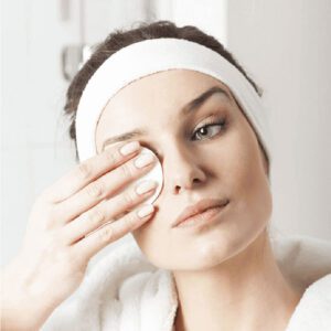 Bước 1: Nhúng bông tẩy trang của Nga vào nước tẩy trang và lau nhẹ nhàng vùng da cần vệ sinh. Mắt nên được lau rửa đầu tiên rồi đến sống mũi, cánh mũi và tiếp đó là các vùng đa khác